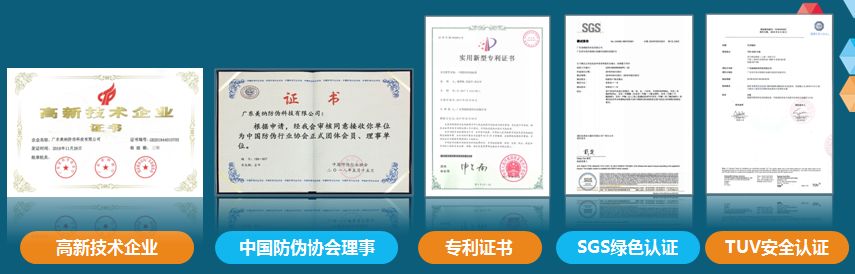 △高新科技企业、中国防伪协会理事、国内国际认证证书、近30项专利证书!
